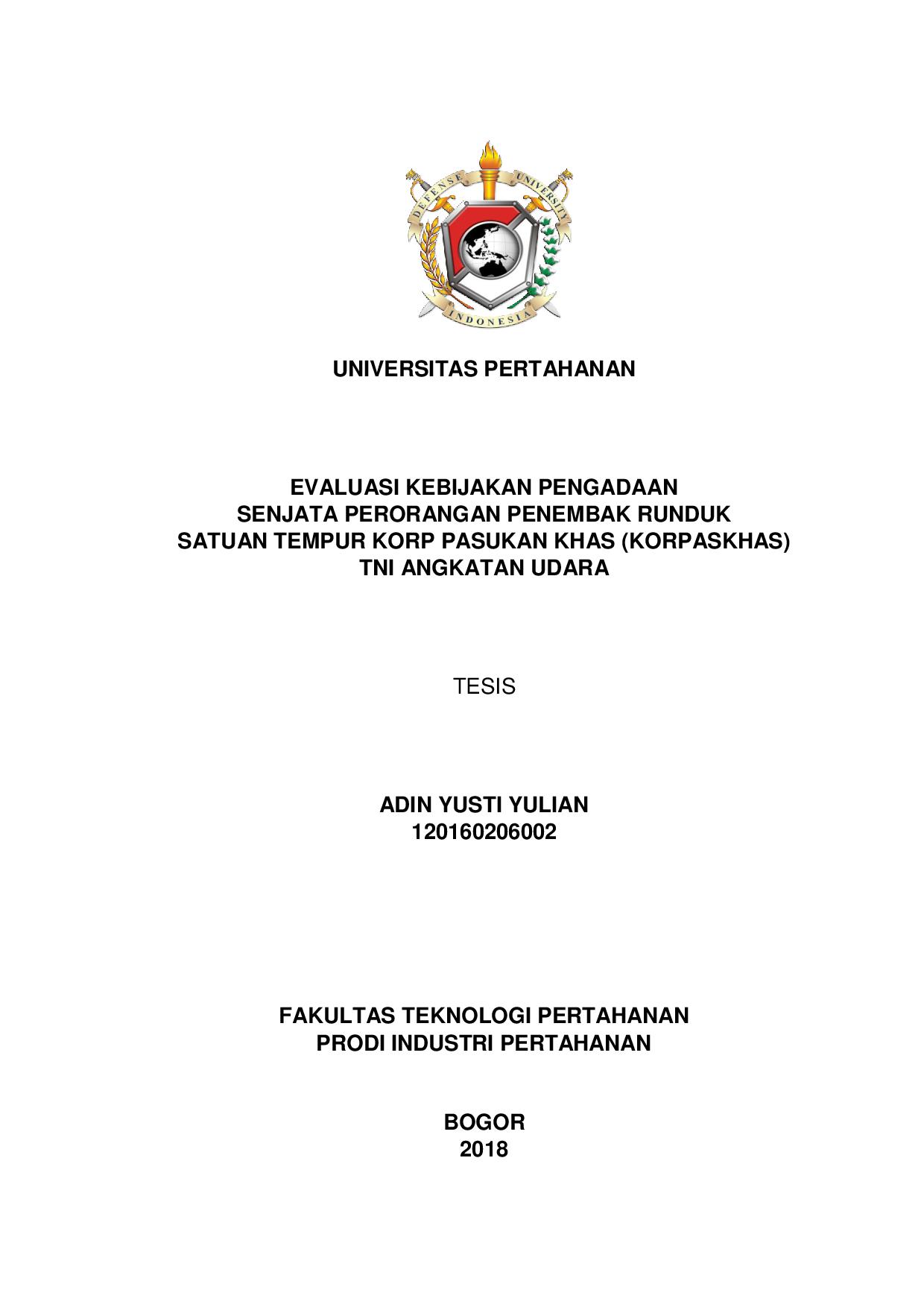 | Judul | EVALUASI KEBIJAKAN PENGADAAN SENJATA PERORANGAN PENEMBAK RUNDUK SATUAN TEMPUR KORP PASUKAN KHAS (KORPASKHAS) TNI ANGKATAN UDARA |