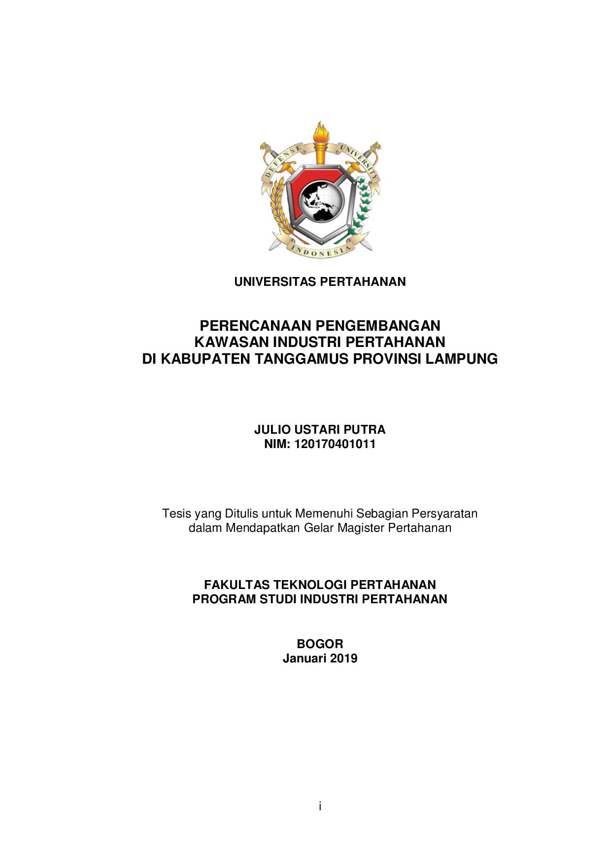 | Judul | PERENCANAAN PENGEMBANGAN KAWASAN INDUSTRI PERTAHANAN DI KABUPATEN TANGGAMUS PROVINSI LAMPUNG |